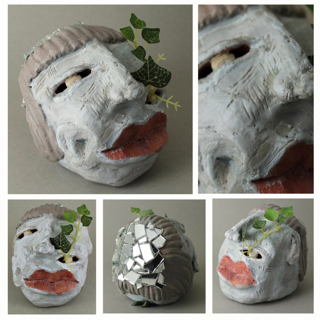 “View of Oneself” Emma Schmidt Ceramic, Encaustic Wax, Oil Paint, Mirror, Silk Plant 12th, FAHS NFS